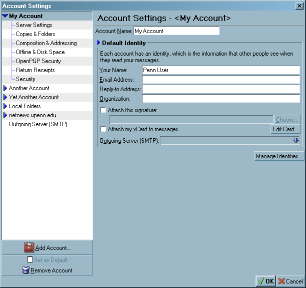 Enhanced Security users may use Kerberos authentication in addition to TLS to encrypt POP,IMAP, and SMTP authentication. These settings are the same for both Macintosh and PC clones. The configurations are set under the Account Settings menu item in the Tools menu.