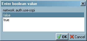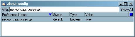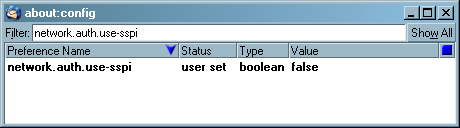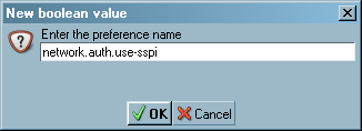 If you do not see any entries for network.auth.use-sspi, right click on the white space under "Preference Name" and choose "New", and then "Boolean".